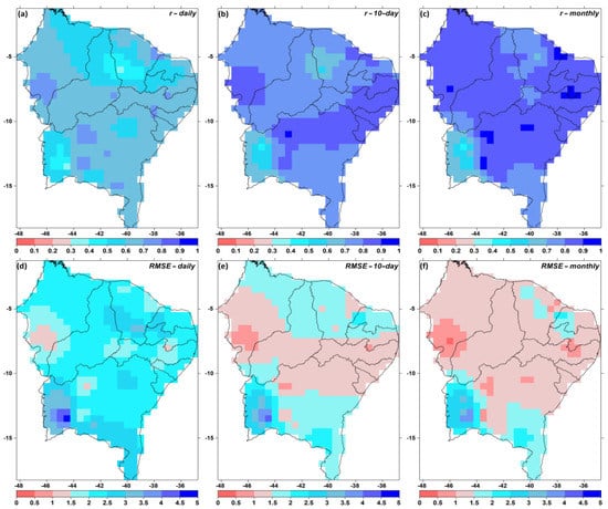 Correlation maps for precipitation between imputed and observed data on the daily (a), 10-day (b) and monthly (c) timescales; and RMSE (mm) on the daily (d), 10-day (e) and monthly (f) timescales.