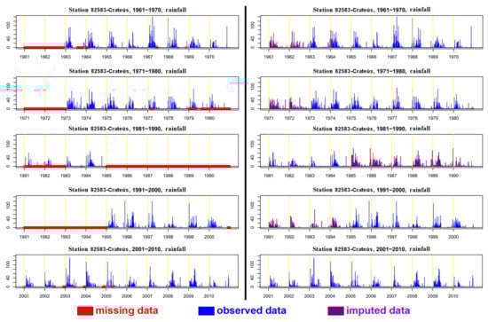 The original series from a station for every 10 years from 1961 to 2010, showing the gaps (left) and after these gaps had been filled (right). The code and name of the station, the subperiods and the variables are indicated in the graph. Originally missing data are indicated by the red colour, while blue implies observed data and violet indicates imputed data.