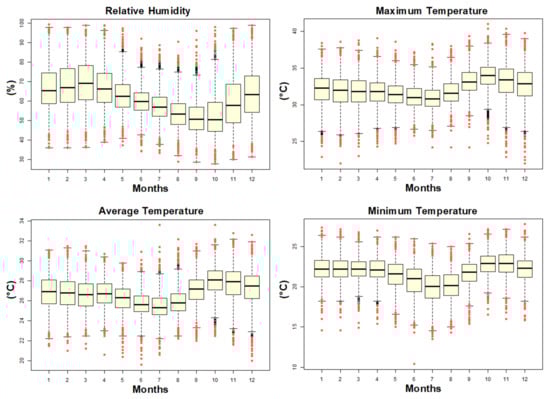 The result of this test is also graphically presented in a box-plot graph. Figure 11 shows these results for relative humidity, maximum temperature, average temperature and minimum temperature, where the red dots refer to values that exceeded these variable limits based on the 1% and 99% percentiles. For precipitation, it was estimated that, for each month, the 95%, 97.5% and 99% percentiles would be used as limits to identify potential extremes of daily rainfall. These percentiles were calculated using the parameters of the gamma distribution adjusted for each month of the year.