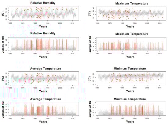 The output of this test is printed and plotted, comprising the day, the variable and the doubtful value. Figure 12 shows these results, in two graphical forms, for relative humidity, maximum temperature, average temperature and minimum temperature, where the dots and/or red lines correspond to values that did not respect the limit of the 99.5% percentile of the differences and were therefore characterized as suspicious data.