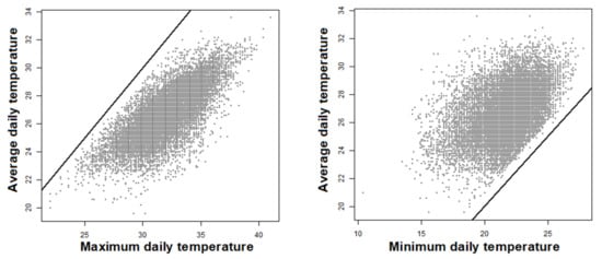 Results of the first consistency test between variables. The figure on the left shows that no average temperature value was higher than the daily maximum temperature, and the figure on the right shows that no average temperature value was lower than the daily minimum temperature. If any of the conditions failed due to suspicious data, these values would be identified as red dots to the left or to the right of the diagonal lines in the graphs.