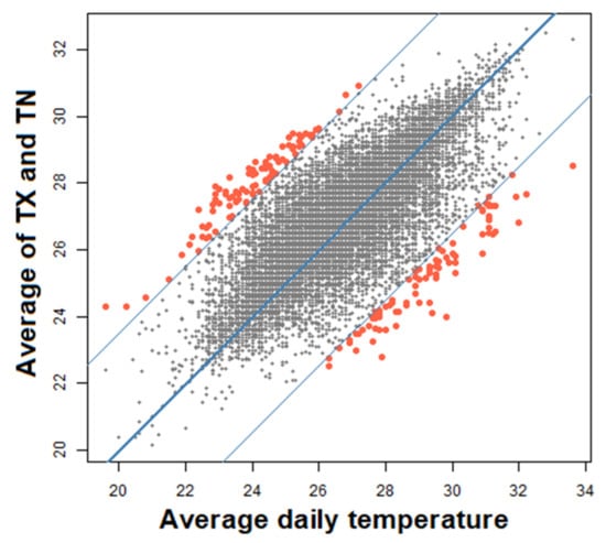Result of the consistency test for the average daily temperature. The red dots represent values for which the difference between the daily average temperature and the average between maximum and minimum temperatures exceeded the 99% percentile.