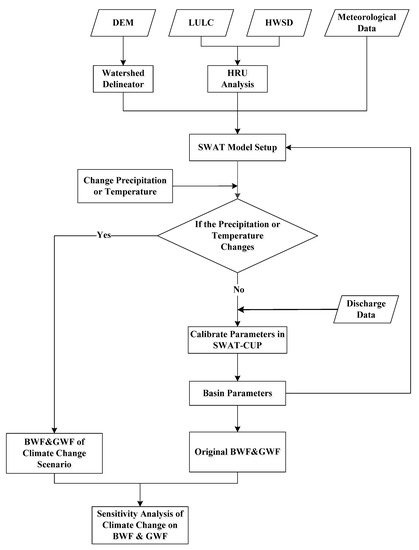 As shown in Figure 2, the climate change sensitivity analysis of the BWF and GWF based on the SWAT model in the middle and upper Yarlung Zangbo River was conducted using the following steps: (1) constructing a SWAT model based on space remote sensing data and measured meteorological data; (2) using the SWAT-CUP for parameter sensitivity analysis to determine watershed parameters and to obtain original runoff simulation results; (3) changing the precipitation or temperature according to climate change scenarios and building the model to obtain simulation results; (4) assessing the impact of climate change on the amount of blue and green water resources in the basin by comparing the simulation results of various climate change scenarios to those of step (3).
