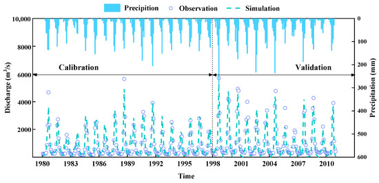The Yangcun hydrological station in the main stream of this basin was used as the control station, and the measured monthly discharge data from 1980 to 2010 were used to verify the model simulation performance, where 1980–1998 was the calibration period, and 1999–2010 was the validation period. Through parameter sensitivity analysis, we identified 11 main parameters in the SWAT-CUP parameter calibration model, and the calibration results are shown in Table 2.