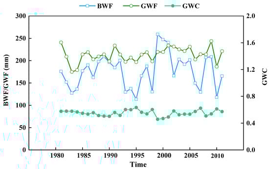 As shown in Figure 4, the BWF and GWF in the middle and upper Yarlung Zangbo River region all have a slight upward trend from 1980 to 2010. BWF has a coefficient of variation (Cv) of 0.21 and a range of 113.6 to 258.8 mm. The maximum value occurred in 1998, and there was a significant change with large fluctuations between 1997 and 2001. The GWF was less variable than the BWF, having a coefficient of variation Cv of 0.08 and ranging from 174.9 to 243.7 mm. The highest value of GWF was recorded in 2008. The green water coefficient (GWC), denoted by GWC = GWF/(BWF + GWF), is used to account for the relative importance of BWF and GWF [13]. With the exception of other periods when it was relatively stable, it also varied slightly around 1998, ranging between 0.46 and 0.63. Prior research indicates that the strongest El Nino event in nearly 60 years occurred from May 1997–May 1998, the warmest year in China since 1980, which resulted in mega-floods in several Chinese basins and in the Yangtze River basin in particular [29,30,31]. This could have contributed to the large fluctuations in the blue and green flow that occurred around 1998.