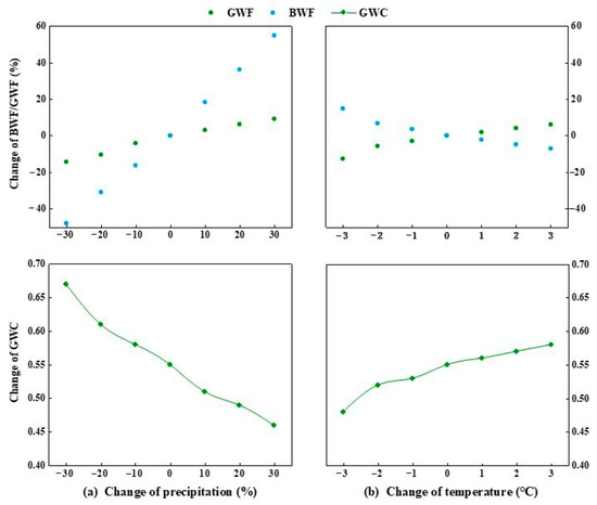 The impact of climate change on BWF and GWF was evaluated by varying precipitation and temperature sequentially. As shown in Figure 6, both the BWF and GWF increased with precipitation, and the BWF increased more than the GWF. For example, a 10% increase in precipitation would change the BWF by 18%, while the GWF would only increase by about 3%. Additionally, this means that the GWC is negatively correlated with precipitation. By changing the temperature, the GWF shows a positive trend with the temperature value, while the BWF shows a negative correlation with it; when there is a greater in the temperature, the change in the BWF smaller. Although the GWC increases with increasing temperature, the magnitude of change is smaller than that of changing precipitation, indicating that the impact of the temperature on the GWC is significantly lower than that of precipitation. The same findings can be found in the studies of Jones et al. [32], Yuan et al. [7], and Zhang et al. [33]. These studies also concluded that precipitation is positively correlated with each runoff component and that precipitation has a greater effect on the runoff component changes than temperature does.