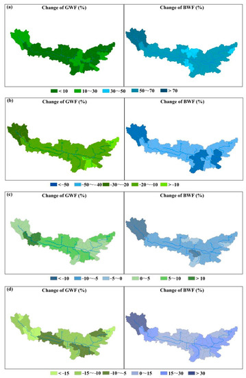Changes in the amount of GWF and BWF in the middle and upper Yarlung Zangbo River under different scenarios: (a) 30% increase in precipitation; (b) 30% decrease in precipitation; (c) 3 °C increase in temperature; (d) 3 °C decrease in temperature.