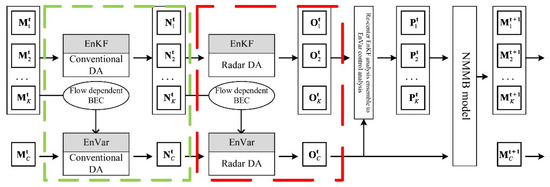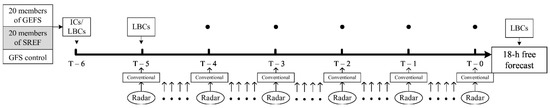 As shown in Figure 1, each DA cycle comprises four steps to assimilate both conventional and radar observations. The reader can refer to Section 3.2 for more details of the assimilated observations.