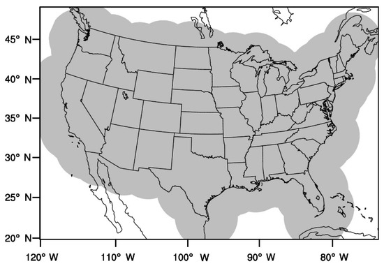 The NMMB model is employed within the NAMRR system. A single domain (Figure 2) is configured by covering the Continental United States (CONUS) with 1568 × 1120 horizontal grid points and 50 vertical levels. The NMMB uses a rotated latitude–longitude grid in the regional applications [54] at a grid spacing of 0.0268° (i.e., 1.9–2.6 km in the mid-latitude) with a center point at 38.7° N/97.0° W. A hybrid sigma-pressure vertical coordinate is applied for the vertical levels with the hybrid interface level at 300 hPa and the model top at 50 hPa. As a convection-allowing horizontal grid spacing is applied in the NMMB model, no convection and cumulus parameterization schemes are used. The other physics parameterizations include the Ferrier-Aligo microphysics scheme [53], the Mellor-Yamada-Janjić planetary boundary layer scheme [55,56,57,58], the Noah land surface model (LSM [59]), and the Rapid Radiative Transfer Model (RRTM) longwave and shortwave radiation schemes [60]. A twice digital filter initialization (TDFI [61]) approach is used with a 2 min half-window length, consistent with [30].