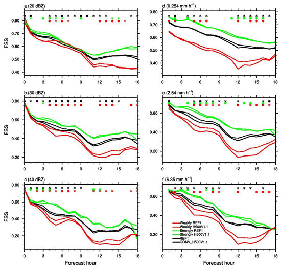 Fractions skill score (FSS) over 10 cases for the composite reflectivity (a–c) and 1 h accumulated precipitation (d–f) fields at the indicated thresholds using the experiments CONV_H500V1.1 (solid lines) and REF1 (dashed lines). The results aggregated over 10 cases are shown as black lines, those over the weakly forced cases are shown as red lines, and the strongly forced cases are shown as green lines. Statistically significant differences between CONV_H500V1.1 and REF1 over the 10 cases, over the strongly forced group, and over the weakly forced group are indicated by the black, green, and red symbols, respectively, along the top axes. The 95% and 90% confidence levels are represented by dot and star symbols, respectively.