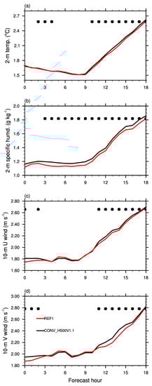 Ensemble mean RMSE against RTMA as a function of the forecast lead times for (a) 2 m temperature, (b) 2 m specific humidity, (c) u-component wind, and (d) v-component wind from CONV_H500_V1.1 (black lines) and REF1 (red lines). Statistically significant differences between REF1 and CONV_H500_V1.1 are indicated by the black dots along the top axes.