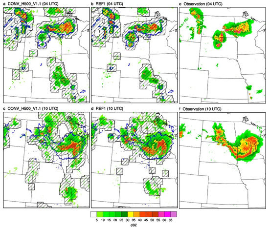 Composite reflectivity (colors; dBZ) at the analysis time (a,b) valid at 4:00 a.m. UTC 10 July 2016 and at the 6 h forecast leading time (c,d) valid at 10:00 a.m. UTC 10 July 2016 for (a,c) CONV_H500_V1.1 and (b,d) REF1. The observed composite reflectivity at 20 dBZ is overlaid in blue contour. The composite reflectivity observations valid at (e) 4:00 a.m. UTC and (f) 10:00 a.m. UTC are also plotted. The simulated composite reflectivity at 20 dBZ with a neighborhood radius of 48 km is shaded with slant solid lines.