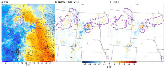 (a) Surface specific humidity (colors; g·kg−1) first guess (FG) valid at 4:00 a.m. UTC 10 July 2016. The increments in specific humidity near the surface from the single DA cycle for (b) CONV_H500_V1.1 and (c) REF1. The observed specific humidity near the surface is overlaid in color circles in (a). The observed composite reflectivity at 20 dBZ is indicated by purple contours.
