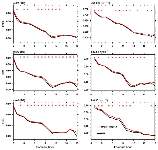 Fractions skill score (FSS) over 10 cases for the composite reflectivity (a–c) and 1 h accumulated precipitation (d–f) fields at the indicated thresholds using the experiments REF1 (black solid lines) and RADAR_H15V1.1 (red dashed lines). The 90% confidence level is represented by the star symbols.