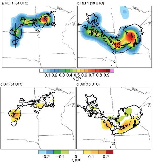 Figure 10 shows a subjective example of the 10 July 2016 case to present the differences in reflectivity analyses and predictions between REF1 and RADAR_H15_V1.1. At the analysis time valid at 4:00 a.m. UTC 10 July 2016, both experiments could capture all storms. However, Figure 10c shows that RADAR_H15_V1.1 tended to capture all convections across South Dakota, North Dakota, and Minnesota with higher probabilities than REF1, especially for the isolated storm cells at the border between South Dakota and North Dakota. Their differences also existed in the later lead times. For example, 6 h later at 10:00 a.m. UTC, RADAR_H15_V1.1 still had more than 0.15 higher probabilities for the convections over northeastern South Dakota and the storm leading-edge areas in southern Minnesota than REF1, while REF1 had less than 0.1 higher probabilities in the stratiform area (Figure 10d).