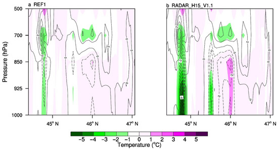 Vertical cross-sections of dewpoint temperature (°C; black contours) and temperature (°C; colors) increments along the black line in Figure 10a for (a) REF1 and (b) RADAR_H15_V1.1 valid at 3:00 a.m. UTC 10 July 2016.