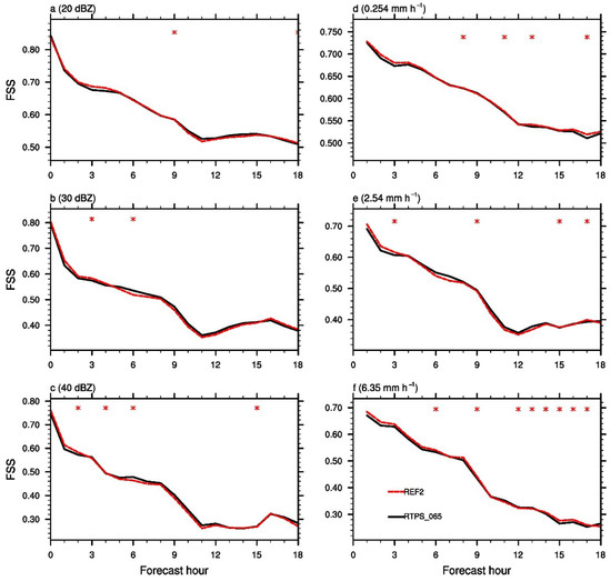 Fractions skill score (FSS) over 10 cases for the composite reflectivity (a–c) and 1 h accumulated precipitation (d–f) fields at the indicated thresholds using the experiments RTPS_065 (black solid lines), and REF2 (red dashed lines). The 90% confidence level is represented by the star symbols.