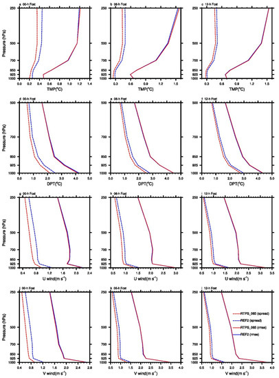 The time series of ensemble mean RMSE verified against RAP analyses and the ensemble spread for the selected upper-air variables at forecast hours of 0, 6, and 12 are shown in Figure 13. Slight error differences were found for all variables at different levels at the analysis time (Figure 13a,d,g,j). For example, REF2 had slightly smaller errors in temperature (T) above 500 hPa than RTPS_065; the errors in dewpoint temperature (DPT) and wind for REF2 were similar to those for RTPS_065 below 700 hPa and at 500 hPa, respectively. During the later forecast hours, both experiments also showed similar errors for all variables, except that REF2 had smaller errors for T in 700 hPa and above at the forecast hour of 6 (Figure 13b). In terms of spread, REF2 improved spread at all levels and variables for all forecast hours over RTPS_065. For example, the spread of REF2 was 0.05–0.1 °C for T, 0.2–0.5 °C for DPT, and 0.2–0.3 m·s−1 for wind greater than that of RTPS_065 at the analysis time. The spread differences became smaller with the increase in lead times. At the forecast hour of 12, the spread differences between REF2 and RTPS_065 were less than 0.05 °C for T, less than 0.2 °C for DPT, and less than 0.2 m·s−1 for wind. However, both experiments still provided under-dispersive ensemble predictions as the spread was remarkably smaller than RMSE during the first 12 forecast hours. To further enhance the ensemble spread during DA, more approaches (e.g., additive noise inflation [79]) to address model errors may be additionally required.