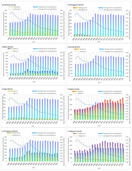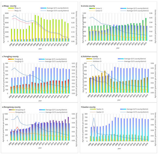 Variations in (a) Maqu county, (b)Linxia county, (c) Yongjing county, (d) Jishishan county, (e) Dongxiang county, (f) Gaolan county, (g) Yuzhong county, (h) Chengguan district, (i) Qilihe district, (j) Anning districty, (k) Xigu district, (l) Jingtai district, (m) Pingchuan district, (n) Jingyuan county, (o) Baiyin district, include: the total GHG emissions (county/district-G) and the intensity of agricultural GHG (county/district-CI) in the main stream of Gansu section of the Yellow River Basin from 2000 to 2019.The average is the county (district) average of total agricultural GHG (Average-G) and GHG emissions intensity(Average-CI), in The Main Stream of the Yellow River Basin in Gansu section from 2000 to 2019.