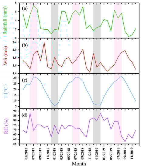 Time series of meteorological parameters: (a) Rainfall; (b) wind speed (WS); (c) temperature (T); (d) relative humidity (RH). The summer and winter periods are marked as shaded pink areas, and gray areas, respectively.