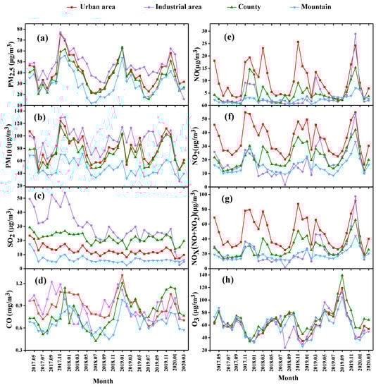 Monthly mean concentrations of air pollutants: (a) PM2.5; (b) PM10; (c) SO2; (d) CO; (e) NO; (f) NO2; (g) NOx (NO + NO2); (h) O3.