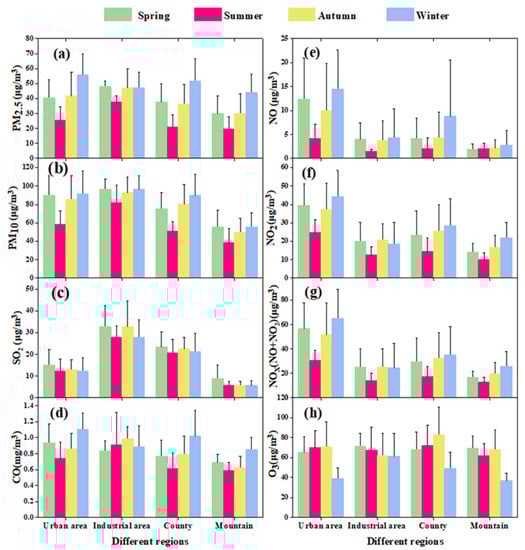 Seasonal mean concentrations of air pollutants: (a) PM2.5; (b) PM10; (c) SO2; (d) CO; (e) NO; (f) NO2; (g) NOx (NO + NO2); (h)O3.