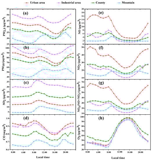Figure 5 shows daytime and nighttime variations of the average concentrations of PM2.5, PM10, CO, SO2, O3, and NOx at urban, industrial, county, and mountainous sites. PM2.5 and PM10 exhibited bimodal distributions at all observation sites. Individually, peaks were observed at 10:00 and 23:00–0:00 at urban, industrial, and county sites, but double peaks were observed at 12:00 and 21:00 at mountainous sites. For the urban, industrial, and county sites, the peaks in the morning may be related to the morning peak activity, the lowest peaks in the afternoon (around 16:00) may be related to the higher solar radiation, and the high values in the evening are attributable to the accumulation of pollutants during the day []. In addition, at urban, industrial, and county sites, nighttime PM2.5 and PM10 concentrations were higher than daytime concentrations, but the opposite trend was observed at mountainous sites (Figure 5a,b). The differences in daytime and nighttime PM2.5 and PM10 concentrations are consistent with the findings of Rimetz-Planchon et al. [], who reported that sites adjacent to industries exhibited higher PM2.5 and PM10 concentrations at night, whereas sites away from industries have higher PM10 levels during the daytime. Moreover, a positive relationship was found between PM10 and PM2.5 (Pearson’s r2 = 0.96), which was consistent with previous observations at other urban/transportation sites [,,].