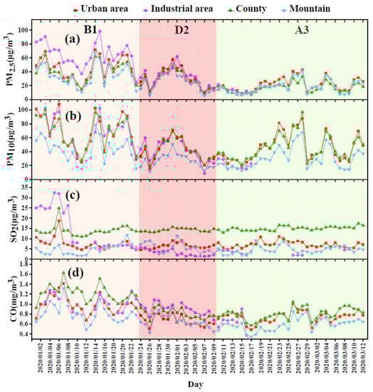 Daily mean concentrations of air pollutants of four regions in Nanchang from 1 January to 12 March 2020: (a) PM2.5; (b) PM10; (c) SO2; (d) CO.