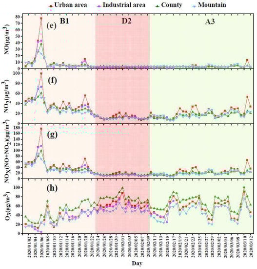 Daily mean concentrations of air pollutants of four regions in Nanchang from 1 January to 12 March 2020: (e) NO; (f) NO2; (g) NOx; (h) O3.