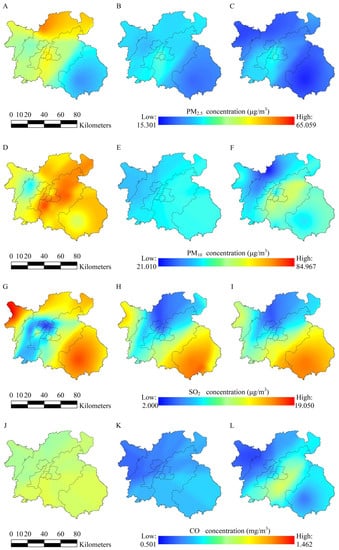 Spatial distribution of PM2.5, PM10, SO2, and CO concentrations in (A,D,G,J) (before COVID-19), (B,E,H,K) (during COVID-19), and (C,F,I,L) (after COVID-19) periods over Nanchang.