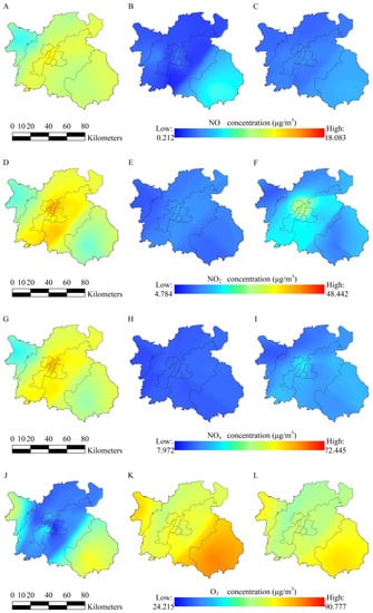 Spatial distribution of NO, NO2, NOX, and O3 concentrations in (A,D,G,J) (before COVID-19), (B,E,H,K) (during COVID-19), and (C,F,I,L) (after COVID-19) periods over Nanchang.