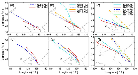 A 24 h back trajectory of airmass arriving at 2000 m (a–c) and 500 m (d–e) over the Yellow Sea (a,d), Seoul (b,e) and Gangneung (c,f). The heights of 500 m and 2000 m represent the heights within and above the PBL, respectively. Each symbol indicates 6 h marks. X denotes Beijing.