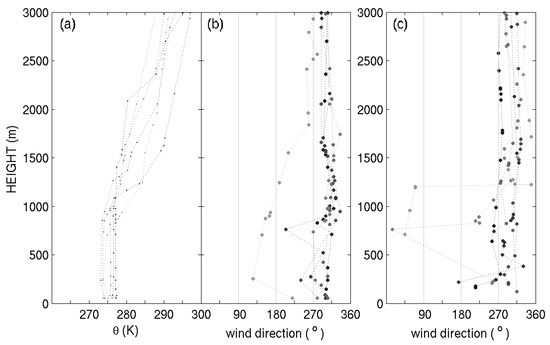Vertical profiles of (a) potential temperature and (b) wind direction at Osan 06 UTC and (c) wind direction at Bukgangneung 00 UTC. Each profile was obtained from the day of flight in Seoul and Gangneung.