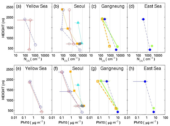 The Ncn and PM10 decrease rate with heights is more prominent over the land than over the ocean, indicating close links between the surface and the source of PM10 and Ncn. The PM10 at Seoul in the PBL (Figure 4f) was 3–30 μg m−3 and 0.1–1 μg m−3 at around 2300 m (above PBL), whereas PM10 over the East Sea in the PBL (Figure 4h) was ~6 μg m−3 and 0.7–0.8 μg m−3 at around 2000 m. Besides, PM10 varied widely over the land, compared with that over the ocean (Figure 4f,g versus Figure 4e,h) and in the afternoon (filled versus open symbols).