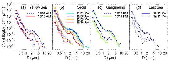 Particle size distributions (PSD) obtained from the (a) Yellow Sea, (b) Seoul, (c) Gangneung and (d) East Sea. Individual lines represent PSDs calculated from level-leg flights within and above the PBL. For example, PSDs on 6 December within and above PBL were obtained from 661 m and 1903 m, respectively.