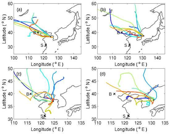 The 3-day back trajectories for the nine flights of [19] are shown in Figure 7 to examine the origin and path of the airmass. The airmasses that arrived at 3000 m over the Yellow Sea and East Sea originated from the northern part of China and passed through Beijing to reach the Korean Peninsula (Figure 7a,b). Airmasses that arrived at 500 m over the Yellow Sea and East Sea originated from a wider area of China (Figure 7c,d). For the Yellow Sea, airmasses originated in northern and southern China and arrived at 500 m over the Yellow Sea via Beijing and Shanghai (Figure 7c). Beijing and Shanghai are among the largest cities in China and they correspond to cities with high air pollution. On the other hand, the airmasses that arrived at 500 m over the East Sea originated from further north (Figure 7d). Interestingly, the airmass did not pass over Beijing or Shanghai and stayed a little longer over the sea for several hours before being sampled. Further, the surface winds over the East Sea during most of the experiment periods were easterly (not shown), indicating that aerosols over the East Sea in their study originated from the open ocean or, at least, stayed over the ocean for several hours before being sampled over the East Sea, even if the aerosols originated from China several days before.