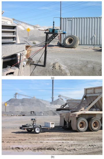 Photographs of the SCAMPER equipment outfitted on the front (a) and rear (b) of the mine haul vehicle.