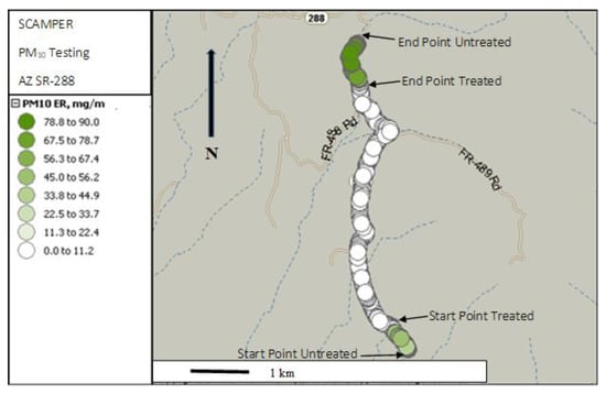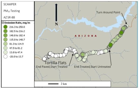 Field measurements of PM10 emission rates were made on two different Arizona state highways, State Routes SR 88 and SR 288. The SCAMPER test vehicle was operated at speeds consistent with safe operation and that observed of other vehicles. The segment of SR88 between mile point 220.1 and mile point 227.5 (12 km) was treated with Envirotac II Acrylic copolymer (Environmental Products and Applications, Inc., La Quinta, CA, USA) at a rate of 1.1 Lm−2. To the west the road was paved and to the east it was unpaved gravel. The section between mile points 226.5 and 227.5 was treated two years before the measurement study and the section between mile points 220.1 and 226.5 was treated five months before. The SCAMPER testing was conducted from Tortilla Flats, AZ (GPS coordinates 33.5268 by −111.3896) eastbound on paved road to mile point 220.1 (GPS coordinates 33.5383 by −111.3258) where the road transitioned from paved to treated gravel. The treated section ended at mile point 227.5 (GPS coordinates 33.5483 by −111.2563) and the SCAMPER vehicle continued eastward on untreated gravel until reaching GPS coordinates 33.5829 by −111.22143 (10 km) where it turned around and headed westbound back to Tortilla Flats.