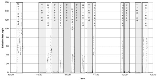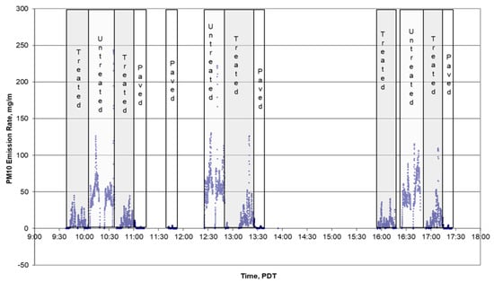 Figure 4 summarizes the data on a map. The higher emissions at the top and bottom of the section are from the unpaved segments while the much lower ones are clearly seen in the middle. Figure 5 shows the time series of PM10 emission rates calculated as a running ten-second average for periods when the running average speed was greater than 16 km h−1. The data from treated and untreated unpaved roads are highlighted.