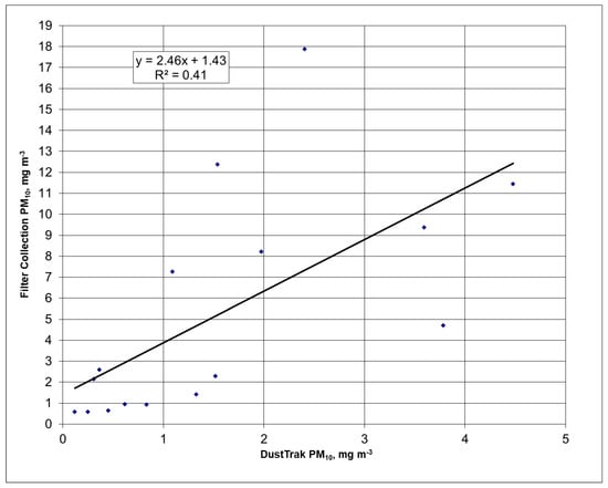 The DustTrak™ is calibrated at the factory using a standard NIST Arizona road dust. Figure 6 compares the PM10 filter concentration data with the concentration data from the collocated DustTrak™ integrated over the period in which the collocated filter sampler was operated. The 0.41 R2 value and slope of 2.5 is typical of what we have previously measured with SCAMPER [], indicating that the DustTrak™ emission measurements presented here are low by this factor when compared to emission rates on a mass basis.