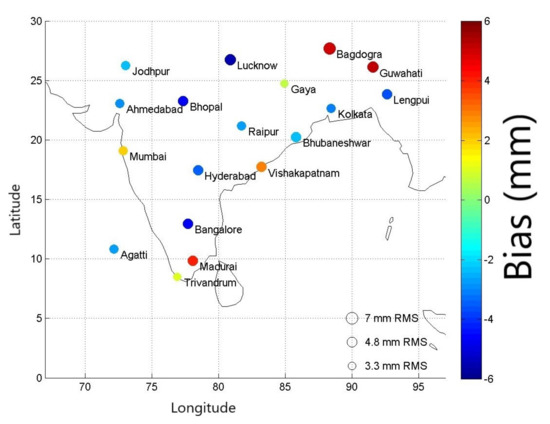 Bubble plot depicting station-wise comparison between GPS-derived IWV and IWV from ERA-I after bias correction of surface pressure. (The colors depict the bias in mm for each station, and the size of the bubbles depict the RMSE).