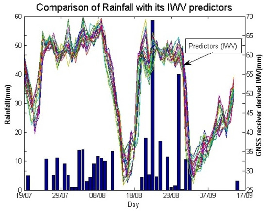 Rainfall and IWV are closely related in the tropics [4]. However, as suggested by earlier studies [5], it is unlikely that the increase in IWV may only be attributed to precipitation. The relationship of IWV with precipitation is quite complex and inhomogeneous; however, it is considered to be reasonably strong in the tropical regions. The peaks of IWV indicate events of strong precipitation, due to tropospheric moistening of convective cells resulting in positive moisture-convection feedback [6]. Due to this positive correlation, the IWV qualifies naturally as a potentially useful parameter for prediction of rain, a hypothesis which is tested later in this manuscript.