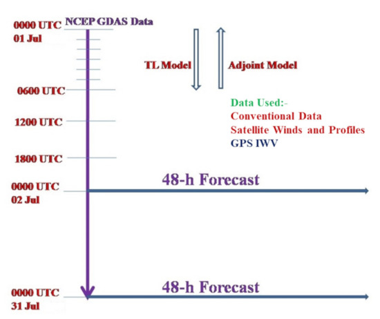 Two simultaneous assimilation experiments (GPS and CNT) are performed in this study with and without assimilation of GPS-derived IWV during summer monsoon 2013. The control experiment (CNT) uses conventional data and satellite winds and profiles, while the GPS experiment uses GPS-derived IWV in addition to this data. Six hourly 4D-Var assimilation cycle are performed starting from 0000 UTC 01 July 2013 to 0000 UTC 31 July 2013 to assimilate the hourly GPS data (see Figure 5). Instead of directly starting from the NCEP Global Data Assimilation System (GDAS) analysis, six hourly WRF model forecast valid at 0000 UTC 01 July 2013 is used for initial condition for both the assimilation experiments. In cycling approach, forecast from previous cycle uses as the background for the next cycle, which is more consistent with forecast model. Conventional observations like SONDE, SYNOP, METAR, BUOY, SHIP, etc. are used in all the experiments. Lateral boundary conditions are taken from NCEP GDAS analysis.