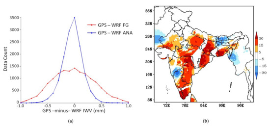 Various sensitivity studies have been performed to assimilate the GPS IWV data to improve the prediction skill of numerical models [13,14,15]. Kuo et al. [14] showed that the assimilation of precipitable water improves the vertical structure of moisture and precipitation predictions. Vedel et al. [15] processed GPS data from Western Europe network and assimilated into the HIRLAM NWP model. Authors found neutral impact in general, but for a severe rain event, assimilation of GPS improved the forecast skill and suggested that the GPS data has excellent potential for improving numerical models in rapidly developing, high moisture flux situations. The most significant finding is that the forecast skill is improved with assimilation of GPS-IWV data each year as the number of stations has increased; this suggests that the increase in the network density can lead to further forecast improvement. In the Indian context, Kumar et al. [16] found a small positive impact on 24-h forecasts upon assimilating observations from a single GPS station in Bangalore. In contrast, the current study analyzes the impact of IWV derived from a network of GPS stations.
