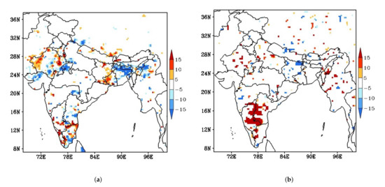 Figure 6a shows the IWV first guess (Observation-Background) and analysis (Observation-Analysis) departures for the entire month of the July 2013. The first-guess and analysis departures have a RMSE of 3.78 mm and 1.79 mm, respectively. The mean differences are changed from 0.21 mm (O-B) to 0.38 mm (O-A). The first guess and analysis RMSE show that in all the cases model IWV analysis are better matched with the GPS-IWV data than the background which confirms the successful assimilation of GPS-derived IWV using WRF 4D-Var. Figure 6b shows the percentage change in the RMSE in the model analysis of IWV. The impact on model analysis is largely positive, with many grid points showing improvements of up to 30%. The map only displays the grid points where the change in forecast skill is statistically significant at 95% confidence interval; further, the comparison is carried out only over land.