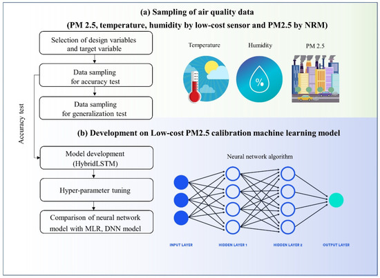 Research flow chart. This work is performed in two steps: (a) data collection for PM2.5, temperature and humidity by low-cost sensor and PM2.5 by gravimetric instrument with high accuracy. (b) Machine learning model development based on the collected dataset. Calibration performance from the developed model is compared with raw data by low-cost sensor and calibration results by benchmark method (multi-linear regression method, DNN).