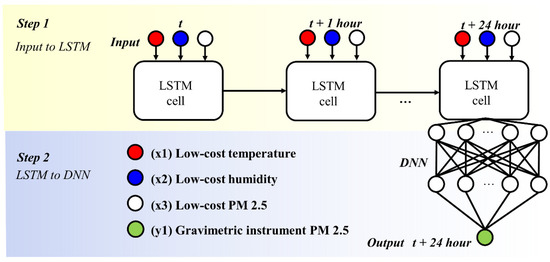 (Step 1) PM2.5, temperature and humidity of the low-cost sensor data described in Section 2.1 are input into the network in the form of a time series including historical trends for 24 h. Values entered with historical data provide time-dependent properties between time-series data through LSTM cells.