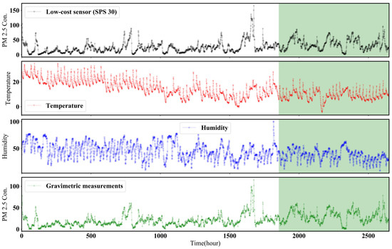 Results of collected dataset. From top to bottom, PM2.5 of SPS 30, temperature and humidity of SHT 85 and PM2.5 of TEOM. The white box region represents the training set that is used to develop the calibration model. The green box region represents the test set that is used to evaluate the developed calibration models. The period of training set is from 30 September 2019 at 18:00 to 18 December 2019 at 16:00. The period of test set is from 18 December 2019 at 17:00 to 21 January 2020 at 18:00. Units of temperature, humidity and PM2.5 concentration are , % and , respectively.