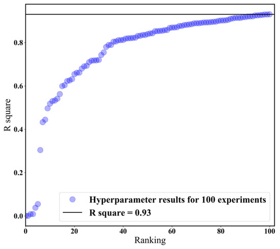 The calibration accuracy by the ML model is affected depending on the combination of hyper-parameters (such as learning rate, network architecture, batch size, optimization function, etc.). Therefore, it is very important to find an optimized hyper-parameter. However, there is a limit to comparing a huge number of combinations. Therefore, many studies determine the hyper-parameter by trial and error methods [18,19]. In this study, hyper-parameters with optimal ML calibration performance were determined by changing various hyper-parameter combinations. Hyper-parameters with optimal calibration performance were evaluated based on R2. Various variables, such as the number of nodes and layers, batch size, etc., were randomly combined into 100 and evaluated, as shown in Figure 5. The R2 for the optimal combination is about 93%, and the hyper-parameter optimization information is summarized in Table 2.