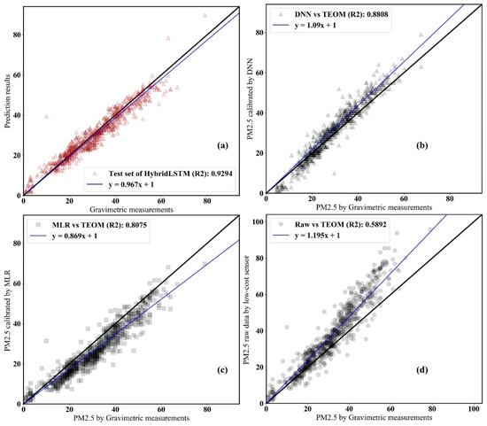 (1) The HybridLSTM PM2.5 calibration model with time-dependent characteristics showed optimal performance in improving the accuracy of low-cost PM2.5 sensors. For RMSE, the proposed model reduced 41–60% of errors compared to the raw data of the low-cost sensor, reduced 30–51% of errors compared to the MLR model and reduced 8–40% of errors compared to the DNN model. Raw data by low-cost PM2.5 sensors showed a significant overestimation compared to the gravimetric method in samples of high PM2.5 concentrations. The slope of fitting curve for the raw data and gold standard data was 1.2. The MLR method showed the underestimated calibration results compared to the measurement results by the gravimetric method. HybridLSTM showed a superior calibration performance when compared with ML models (DNN) that are considered to be state of the art in previous literature [12]. HybridLSTM can provide outstanding calibration results for low-cost sensors. Incorrect monitoring in high-concentration situations not only leads to incorrect exposure assessment, but also leads to errors in determining government regulation. The proposed model showed little variation with the NRM method.